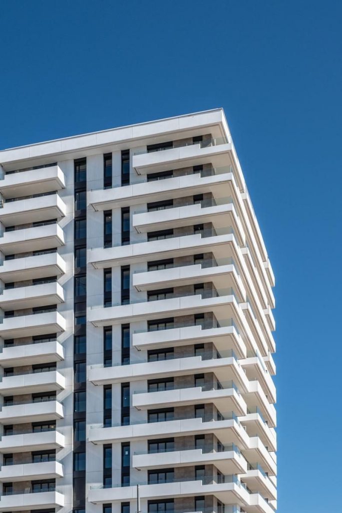 Edificio residencial industrializado: 12 viviendas. Escaleras y núcleos de comunicaciones prefabricados más paneles de fachada de hormigón blanco impreso (tecnología finlandesa Graphic Concrete).